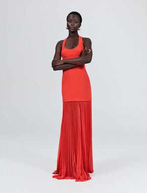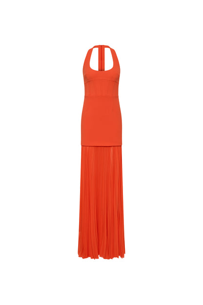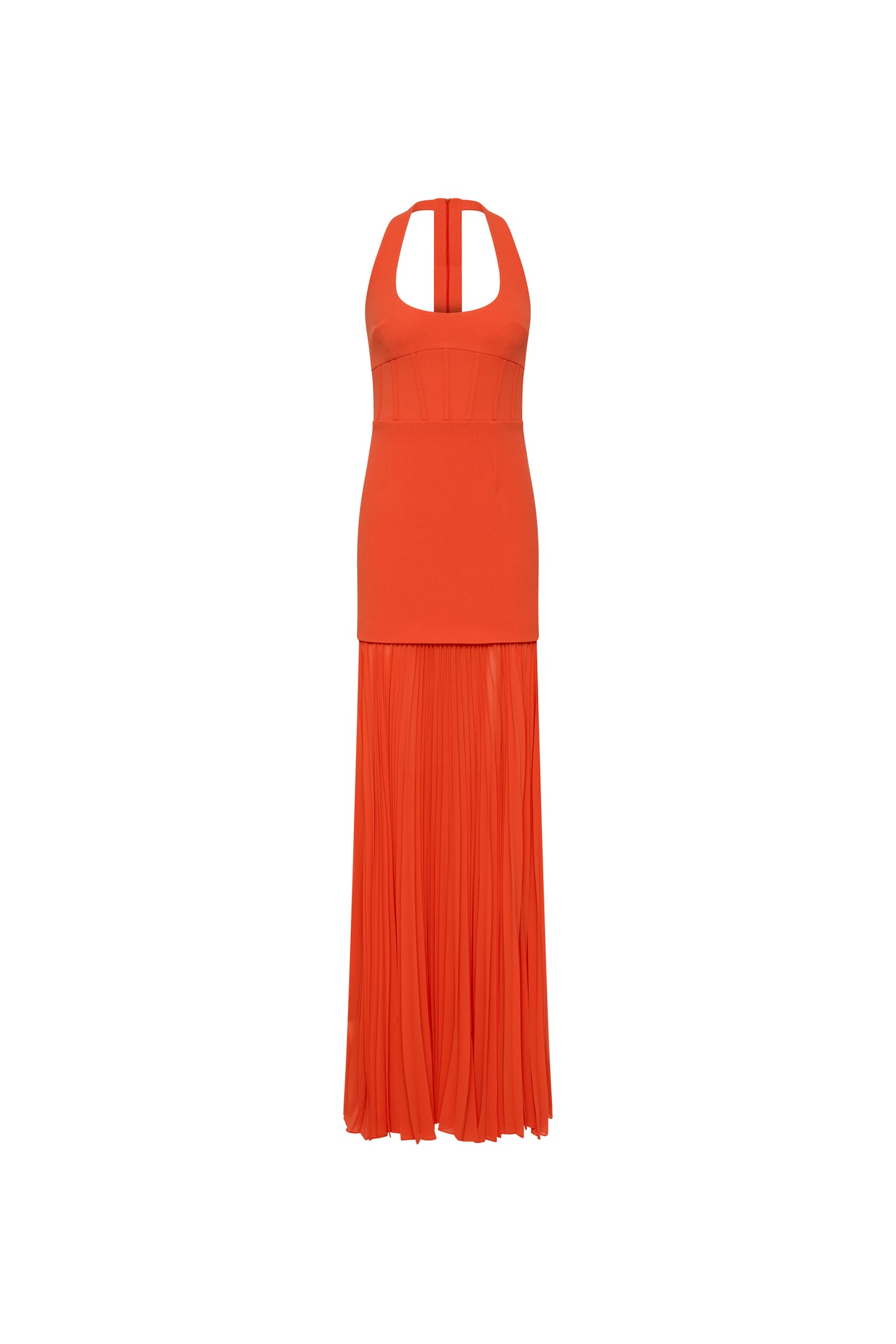 The Empress Maxi Dress captivates in a vibrant orange hue, tailored from bonded crepe. It features a sunray pleated maxi skirt complemented by an A-line mini skirt overlay, creating a graceful silhouette. The scoop neckline and T-bar back frame a flattering shape, enhanced by the corseted bodice and cinched waist to accentuate the figure. Polished and refined, a zip fastening at the back ensures a precise fit, while full lining provides utmost comfort.