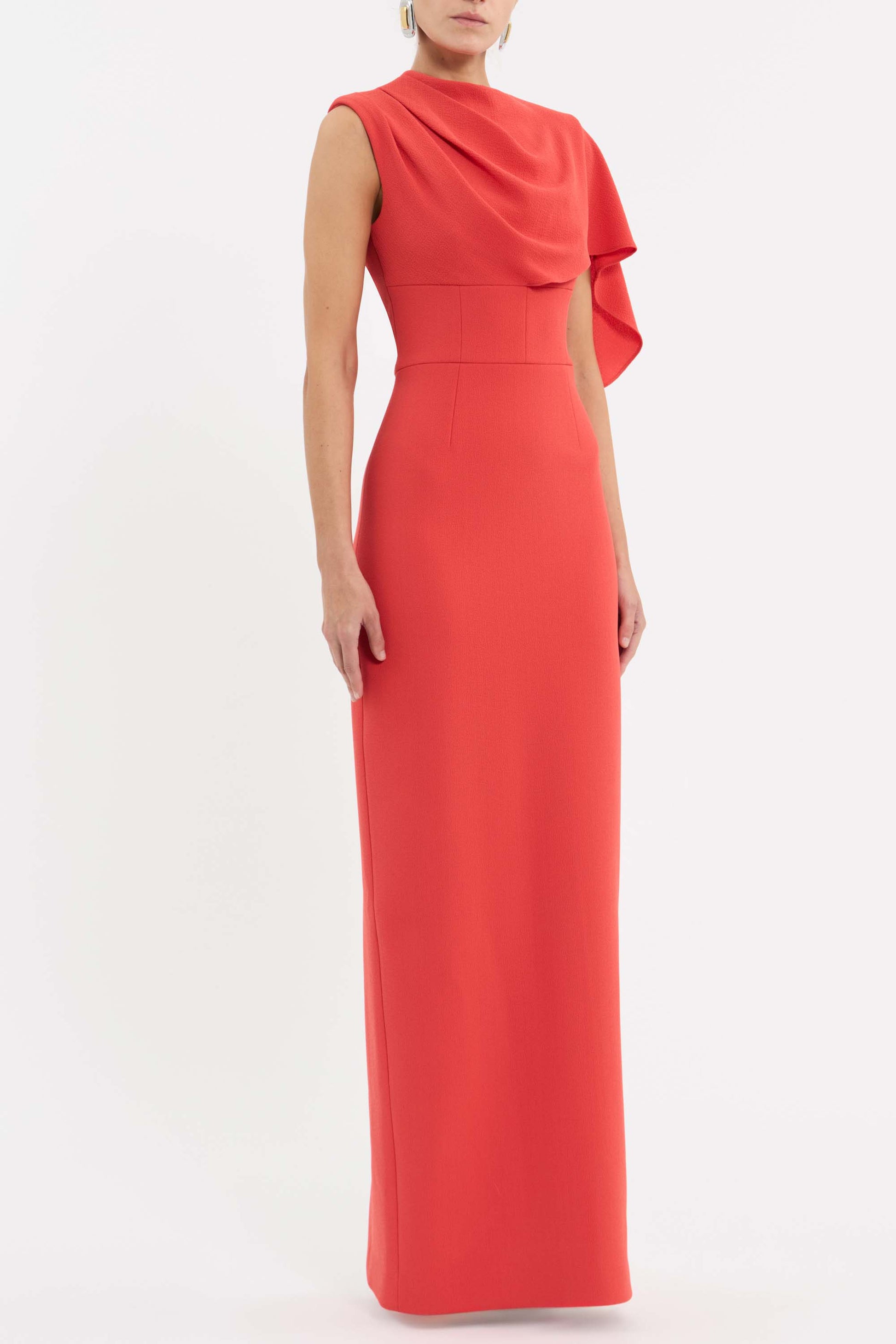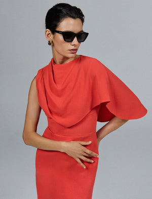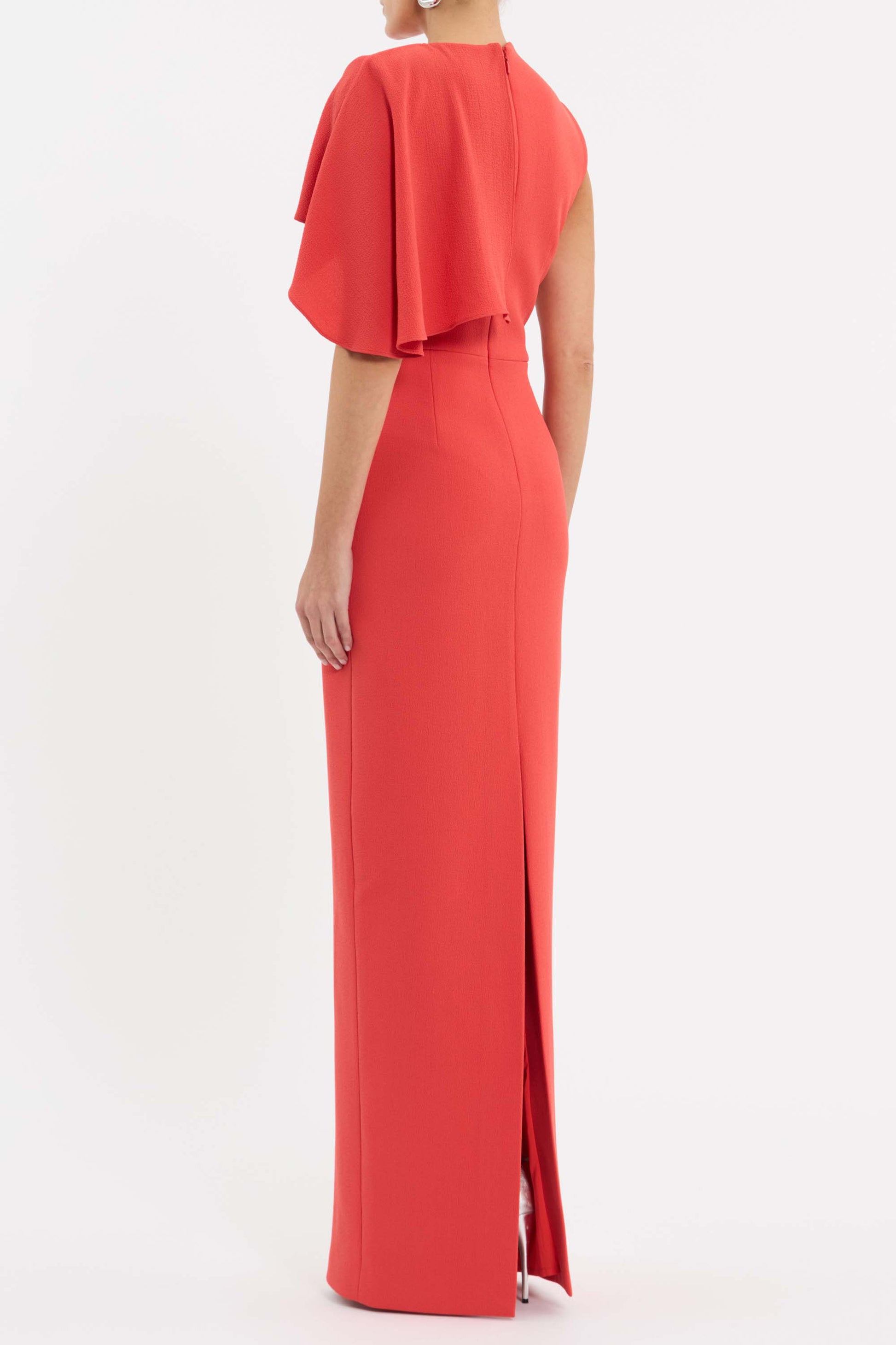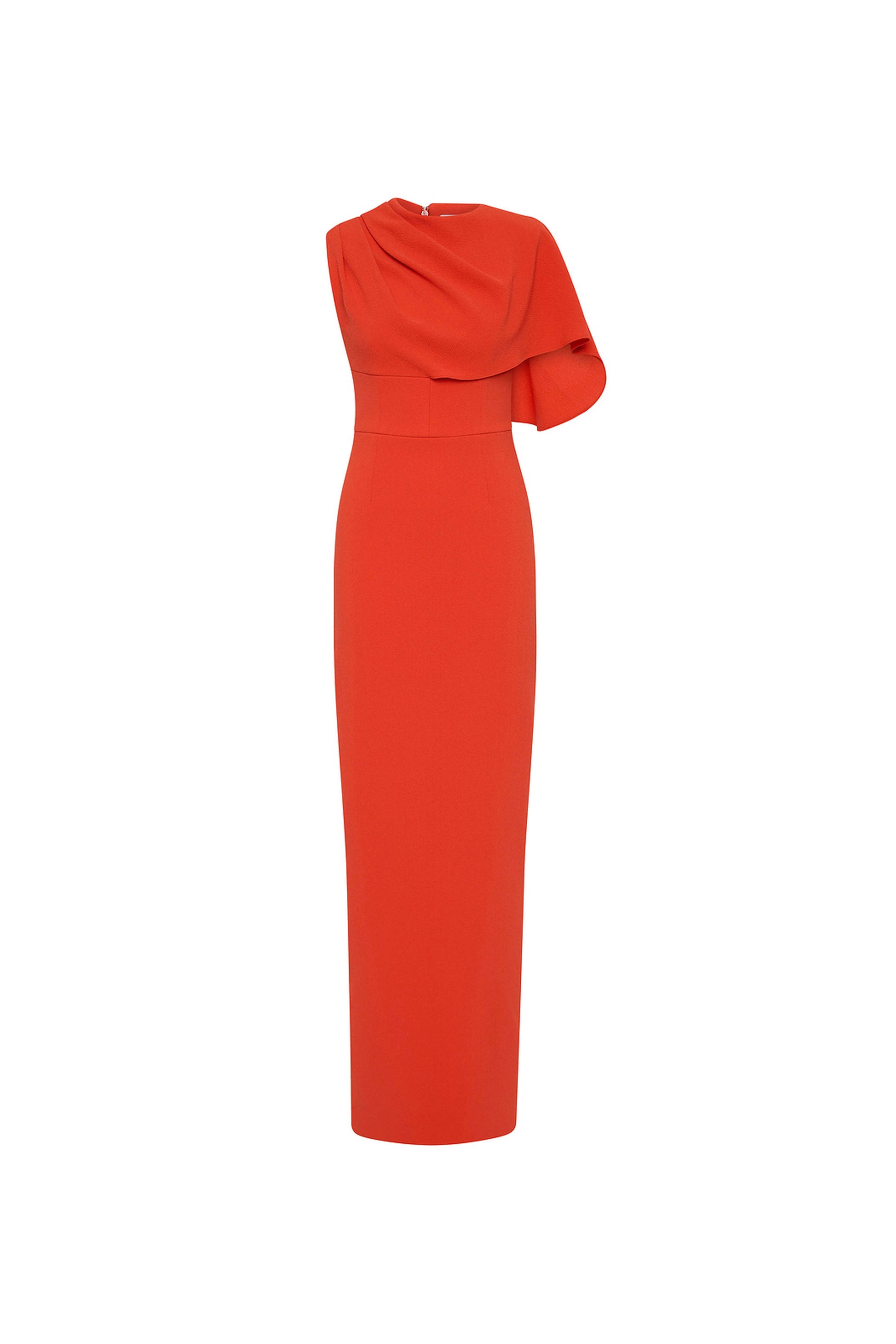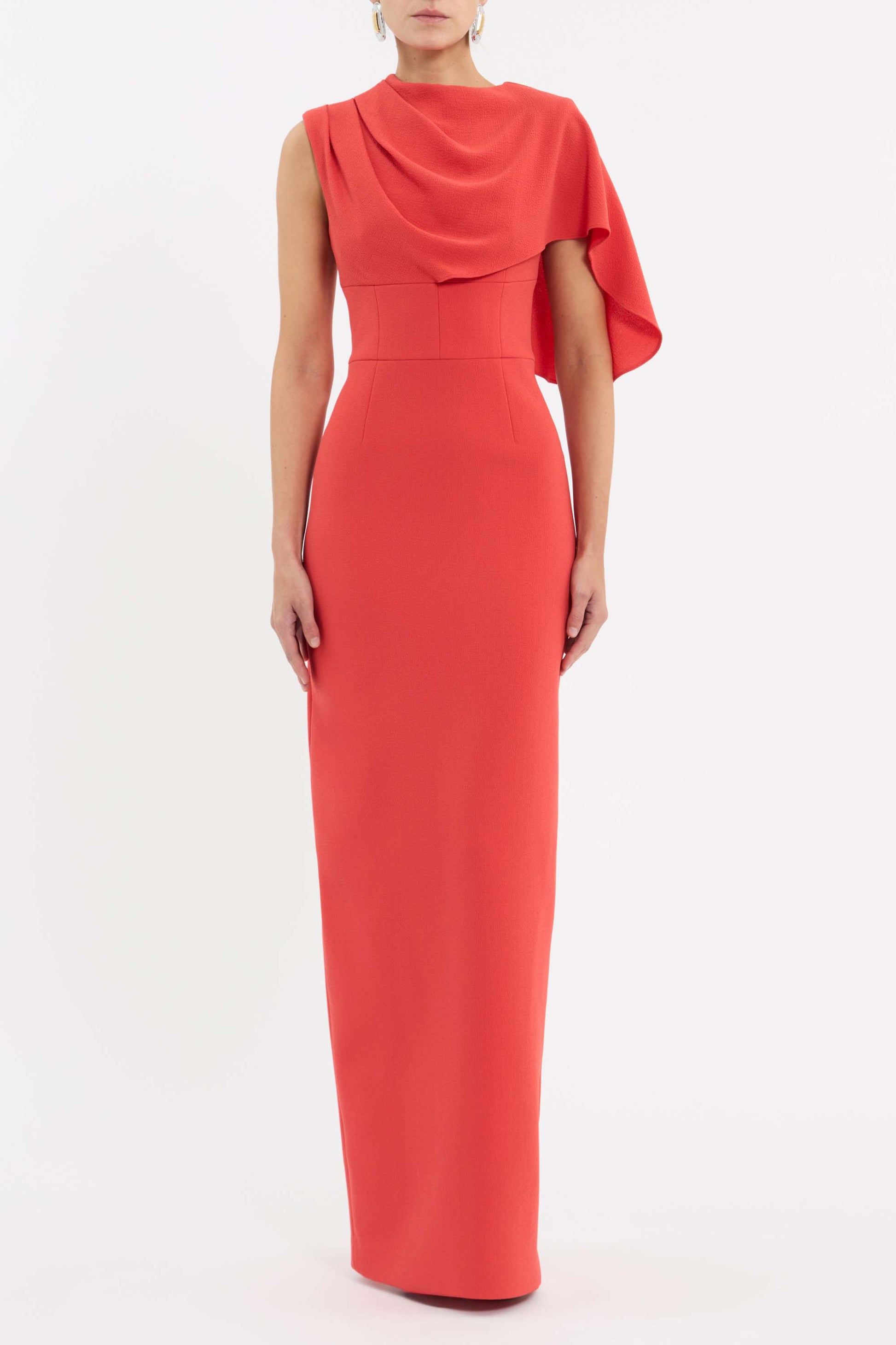 The Freyja Cape Gown in vibrant orange makes a bold yet elegant statement. Tailored from bonded crepe, it features a striking draped cape over shoulder design that enhances the asymmetrical silhouette with effortless sophistication. Grown on sleeves are structured with shoulder pads for added structure, while the maxi column skirt is cinched at the waist to create a flattering shape. Fully lined and complete with an invisible zip fastening at the back, this gown is a standout choice for your next special occasion.
