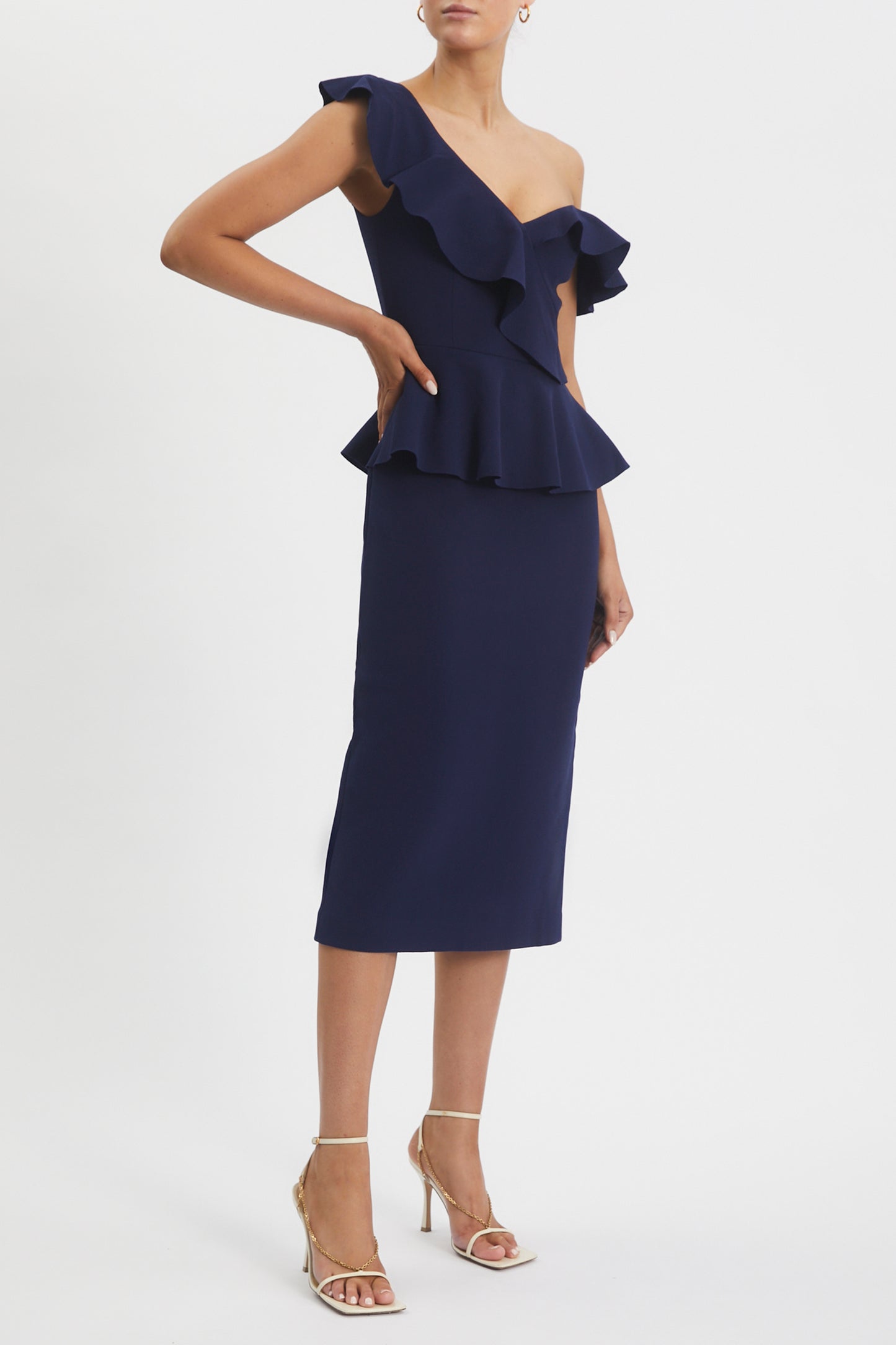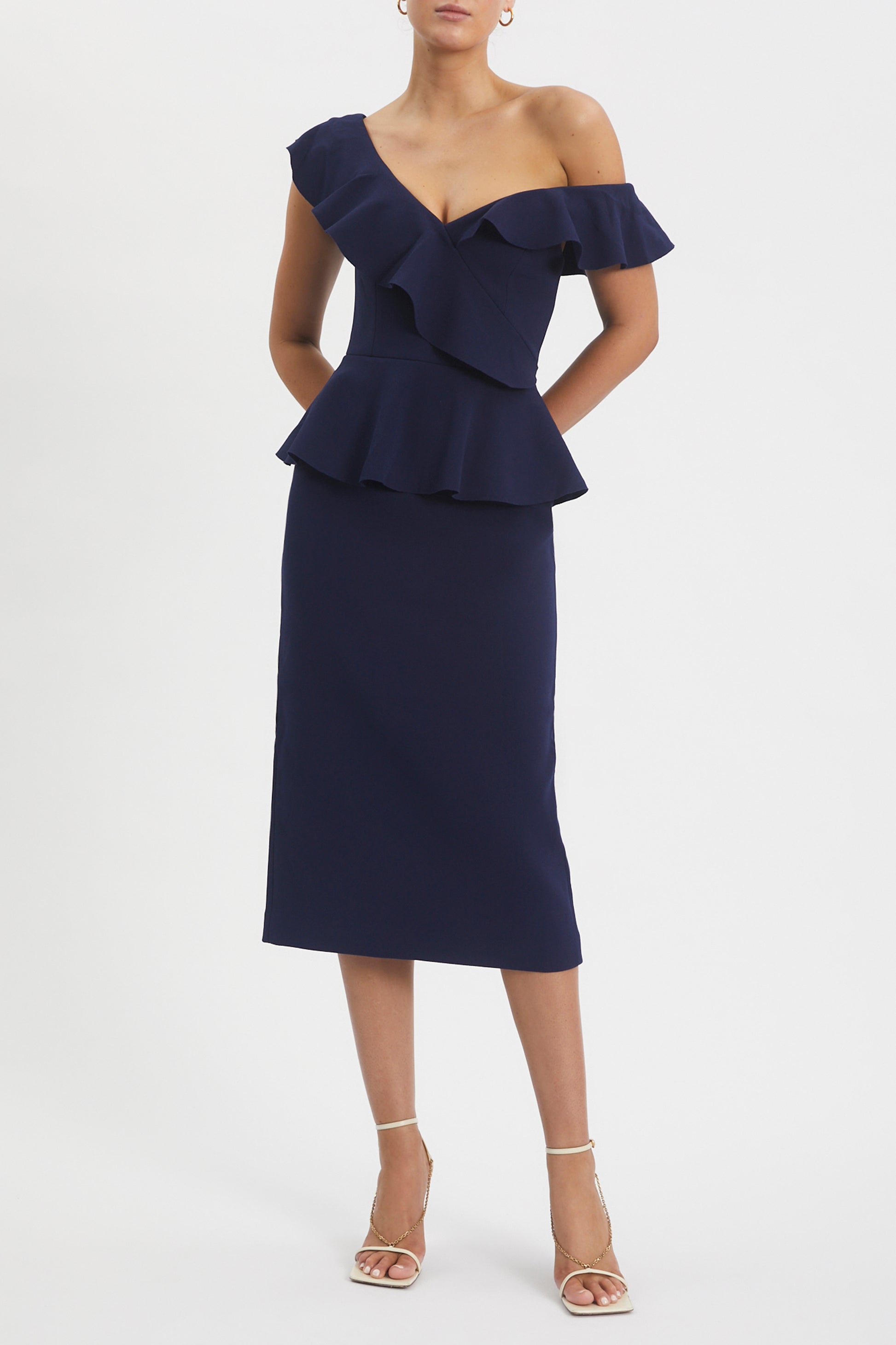 Designed with an asymmetric off the shoulder neckline, the Grace Frill Midi Dress is crafted from a beautifully comfortable bonded crepe and cut with a fitted pencil skirt. This dress is lined.