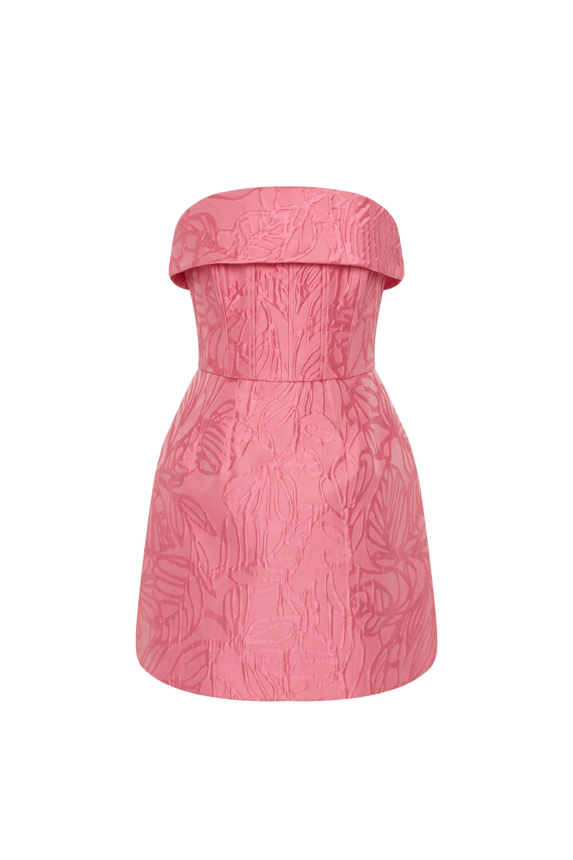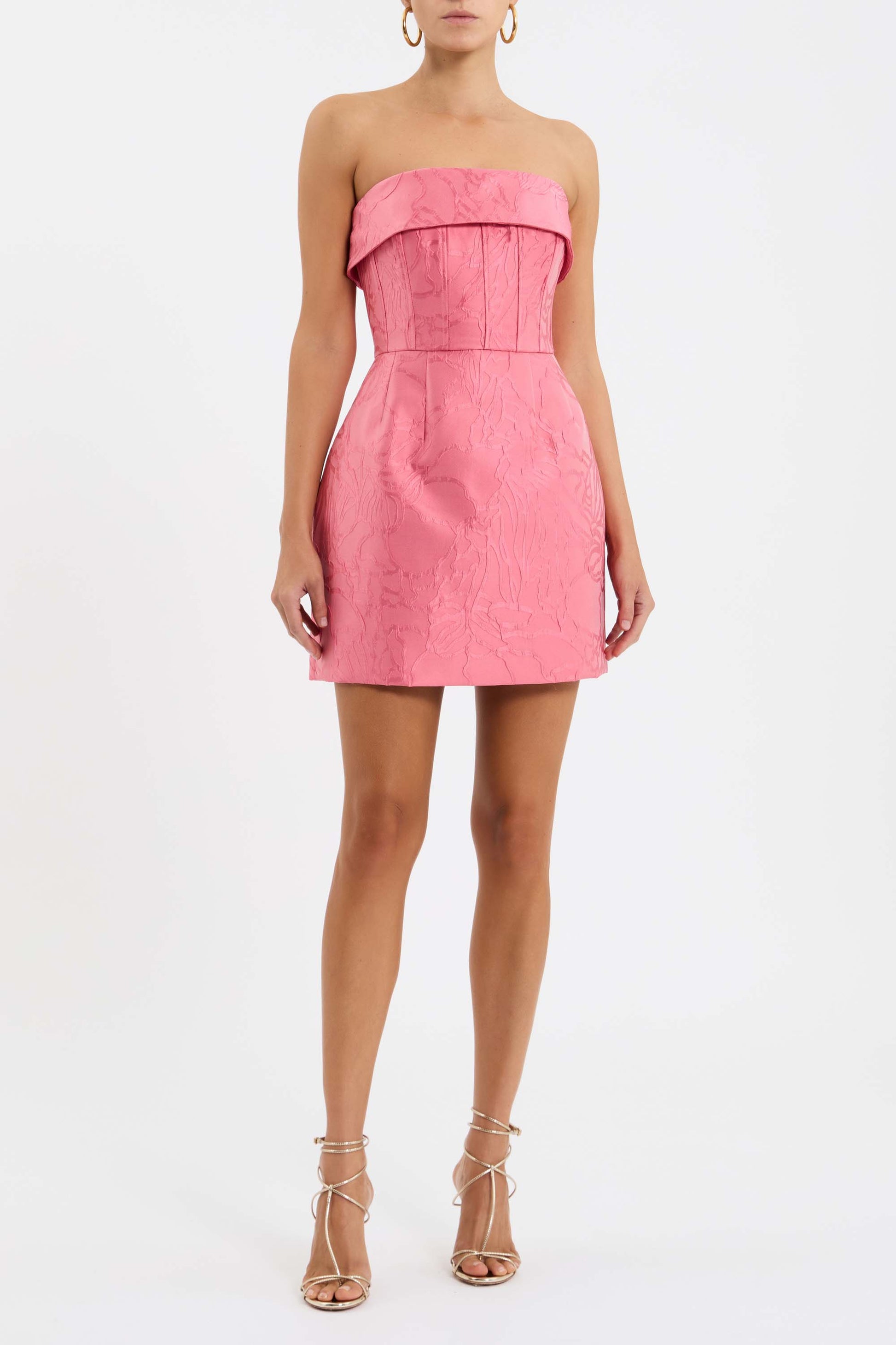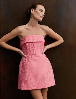 The Petra Mini Dress radiates chic style in pink. Tailored from brocade, the strapless neckline and corseted bodice shape a feminine silhouette, detailed with a bust overlay. A cinched waist defines the figure, while the tulip mini skirt adds a polished finish. Fully lined for comfort and secured with an invisible zip fastening at the back, this dress is a refined choice for your next special event.