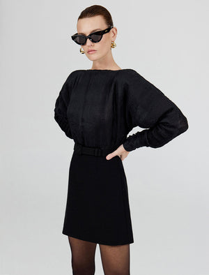 The Ursula Mini Dress in black redefines contemporary elegance. Its sheer, pleated bodice flows effortlessly, with a relaxed fit and cocoon long sleeves that shapes a timeless silhouette. Wide cuffs add a refined edge, while an extended keyhole slit at the back adds a touch of allure to the design. The A-line mini skirt, lined for comfort, is secured with an invisible zip fastening and cinched at the waist by a self-belt.