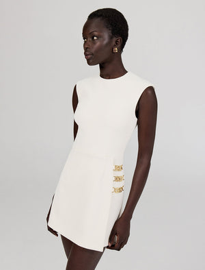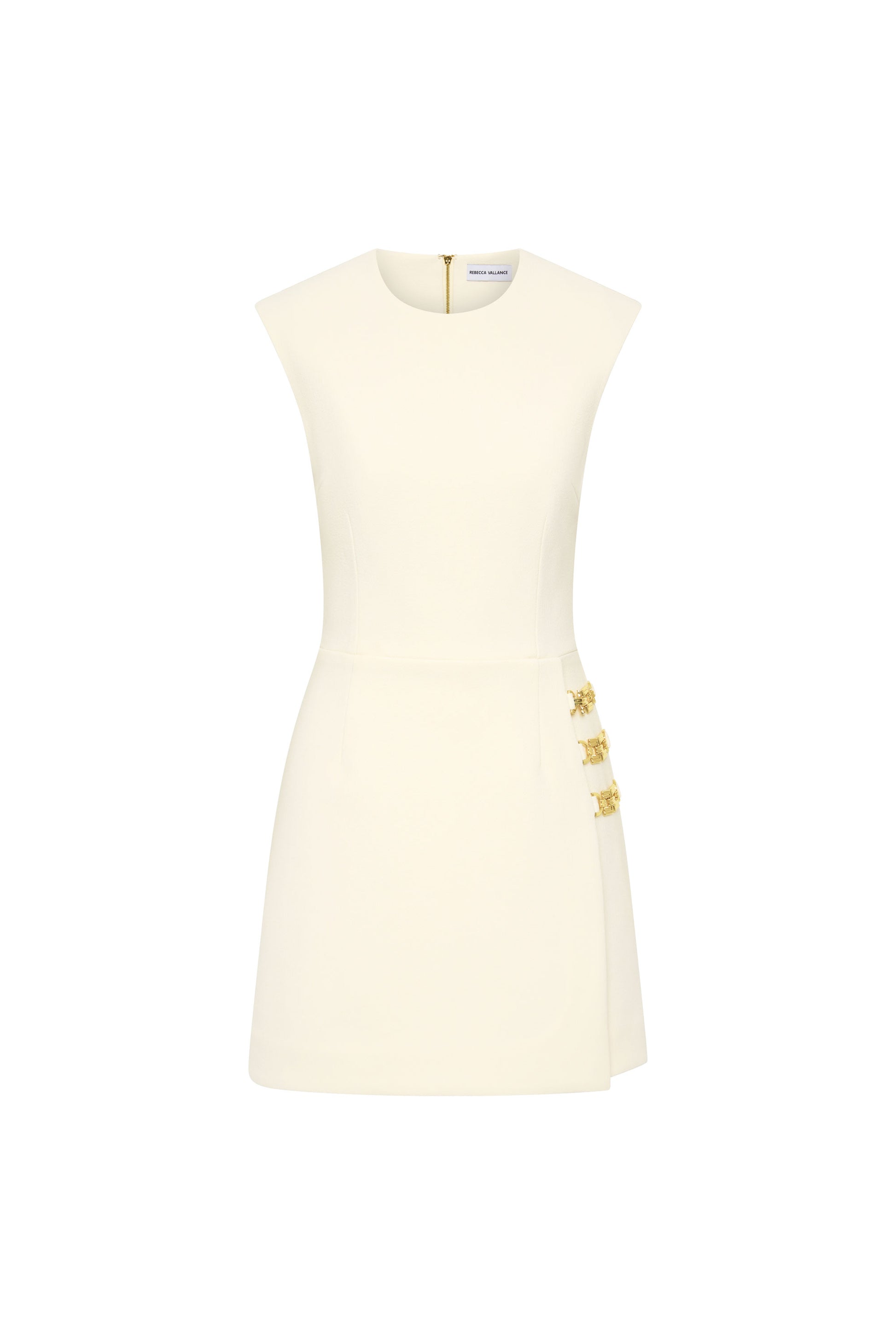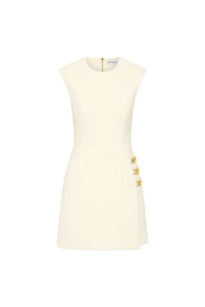 The Freyja Mini Dress in cream radiates timeless elegance. Tailored from bonded crepe, its fitted bodice is effortlessly elevated by grown-on sleeves and a scoop neckline, enhanced with princess seams to flatter the figure. Adorned with gold art deco trim details, the mini wrap skirt shapes a sophisticated silhouette, secured with an exposed zip fastening at the back. Fully lined, this dress is perfectly chic for your next day or night special occasion.