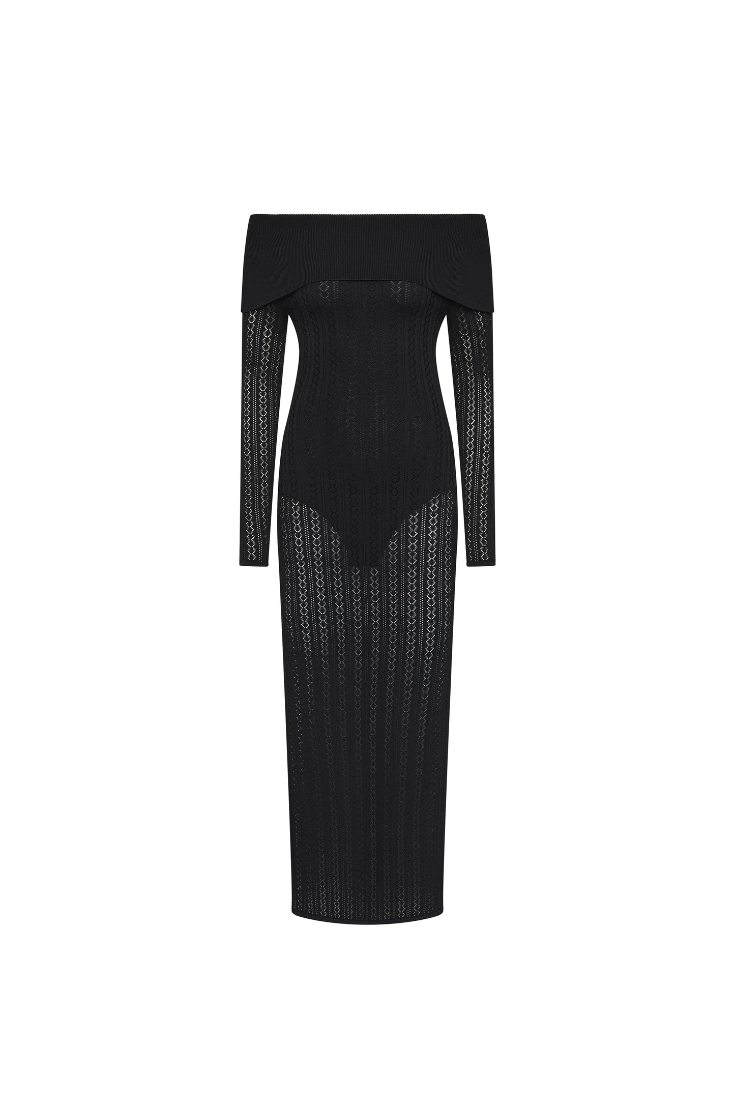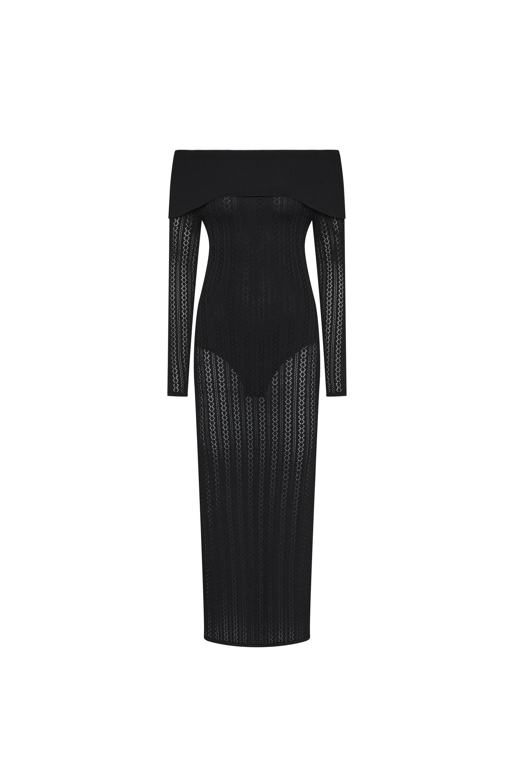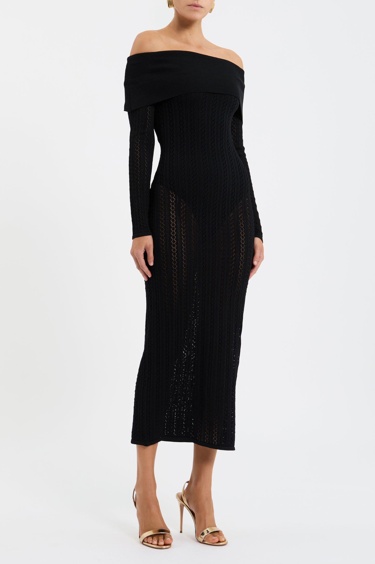 The Lorelei Off The Shoulder Midi Dress in black exudes effortless elegance, tailored from a pointelle knit. Featuring a built-in bodysuit and a sheer overlay, it contours the body in a flattering, feminine silhouette. The off the shoulder neckline and long sleeves add a refined touch, seamlessly blending allure and sophistication. Perfectly polished, this dress is an ideal choice for both day and night special occasions.