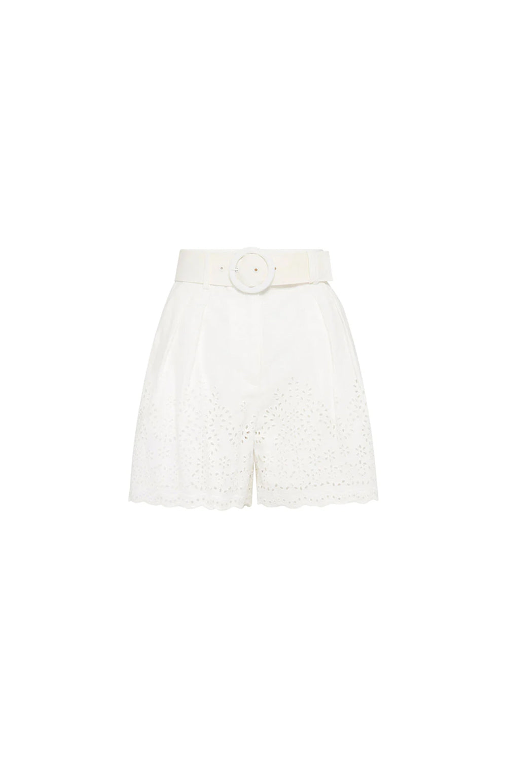 These breathable linen Portia Shorts have a high waisted silhouette and are finished with a broderie anglaise hem. With pockets and concealed zipfly fastening, these shorts have a self covered buckle belt to cinch in the waist. Pair with the Portia Top for a clean crisp look.