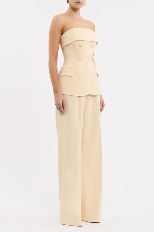 Every silhouette in this collection balances sculptural tailoring with movement. From sharply defined lapels and tailored pants to lightly puffed sleeves and flowing maxi gowns, the line exudes intentionality without overt embellishment. This season, Rebecca drew upon her longstanding collaboration with French and Italian mills to source refined crepes, matte silks, tactile velvets, and crisp weaves. The result is a suite of luxurious designer wedding guest dresses designed to make an impression through poise rather than display.
