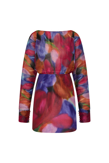 The Cabaret Roses Mini Dress stuns with its playful floral print. Its sheer, pleated bodice with a relaxed fit and cocoon long sleeves reimagines a timeless silhouette, enhanced by wide cuff details for a polished finish. An extended keyhole slit at the back adds a touch of allure, while an invisible zip fastening secures the lined A-line mini skirt. Effortlessly chic, this dress is a lovely choice for your next special event.