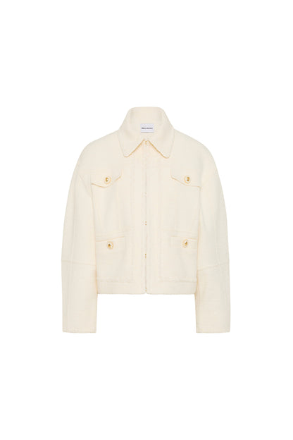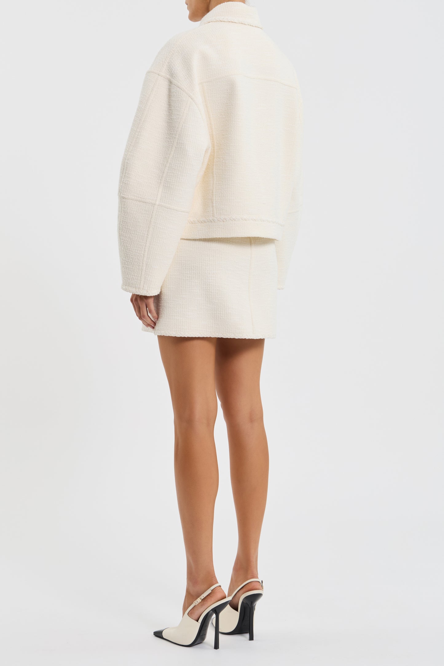 The Jonie Jacket is effortlessly chic in cream. Tailored from tweed, its cropped oversized fit and cocoon long sleeves create a modern silhouette, adorned with braided trims and gold hardware button details. A sleek stand collar adds a sophisticated touch, while lining ensures utmost comfort. Secured with hook and eye fastenings, this jacket is ideal for elevating your styling and pairs perfectly with our Jonie Skirt.