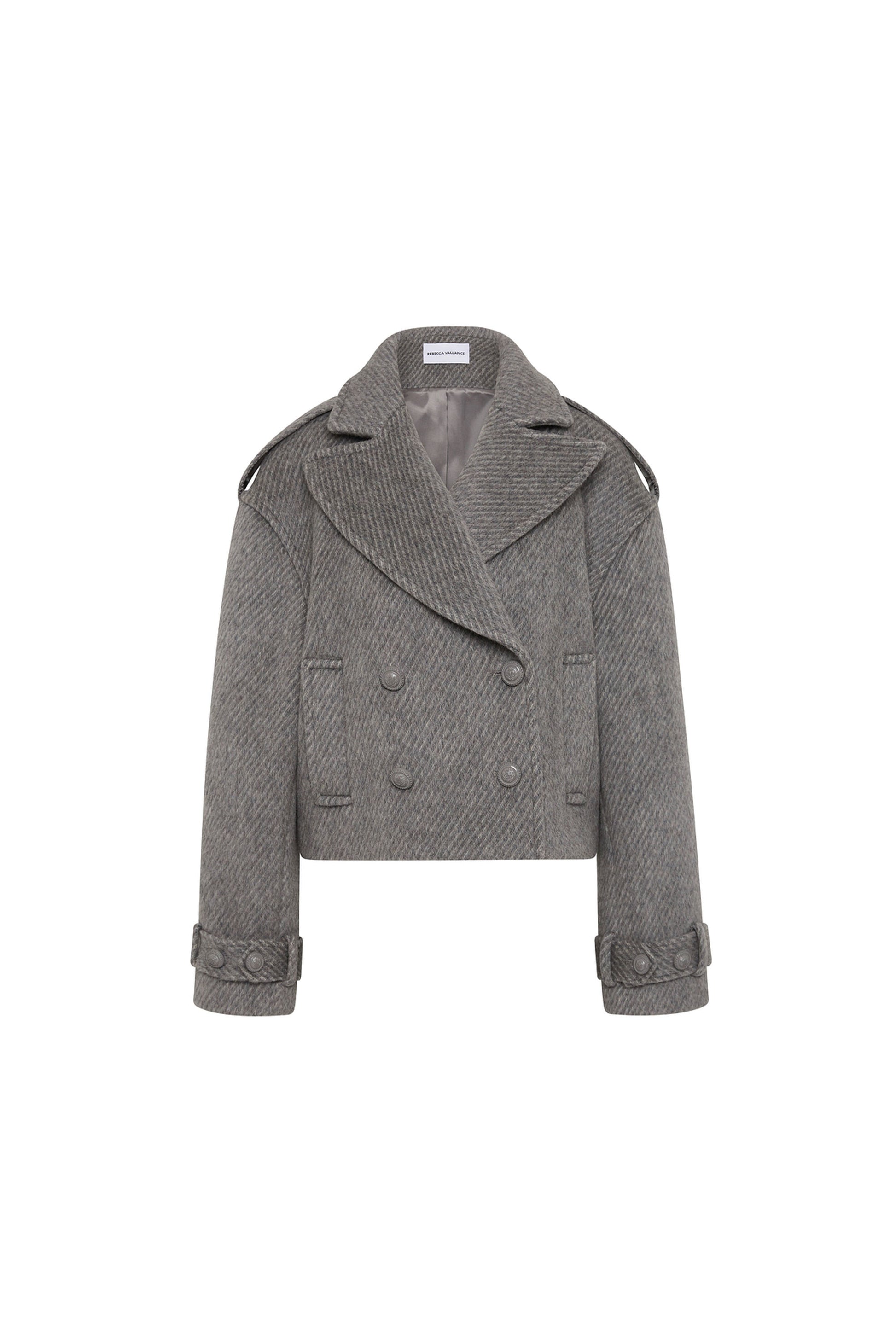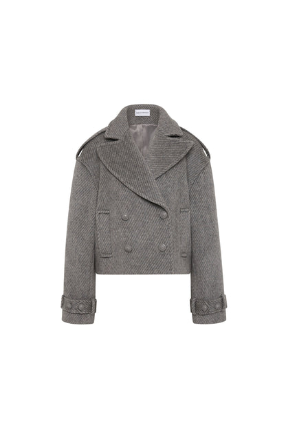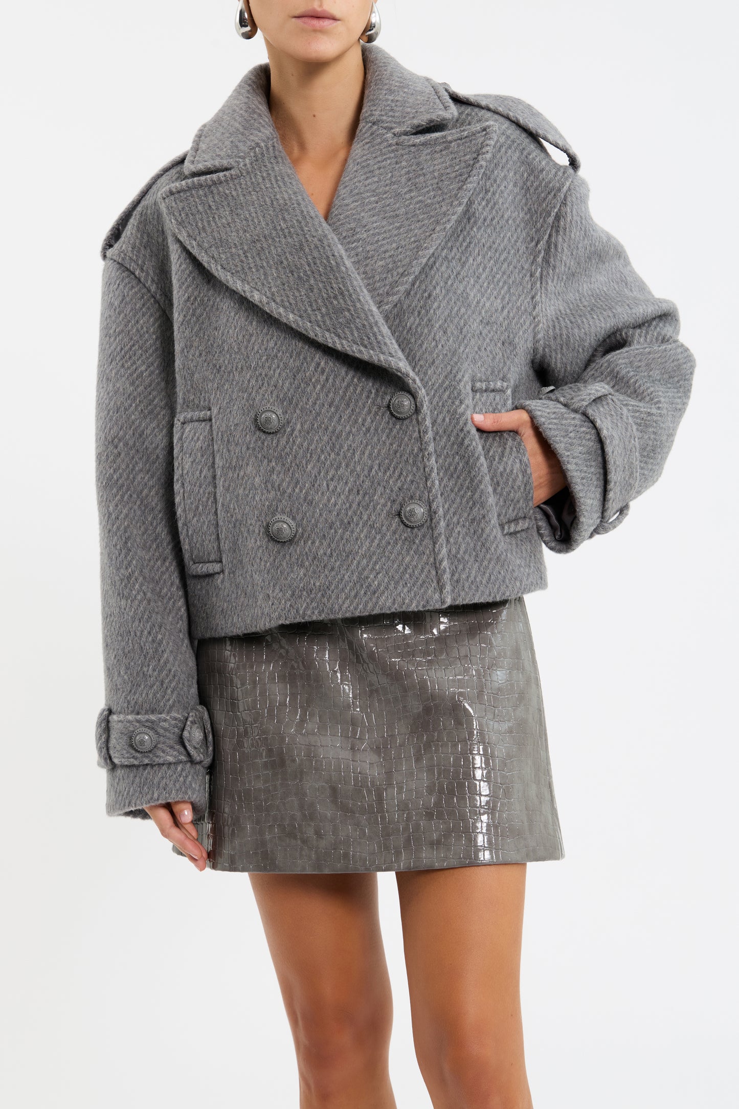 The Lani Coat in grey is the ultimate styling essential, crafted from wool. Featuring a cropped, oversized silhouette, it is detailed with shoulder epaulets and sleeve tabs for a polished finish, adorned with buttons for a chic touch. The double breasted look exudes sophistication, elevated by a sleek collar. Complete with lining, this coat effortlessly balances comfort and timeless style.