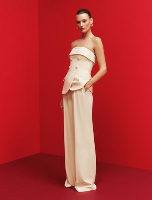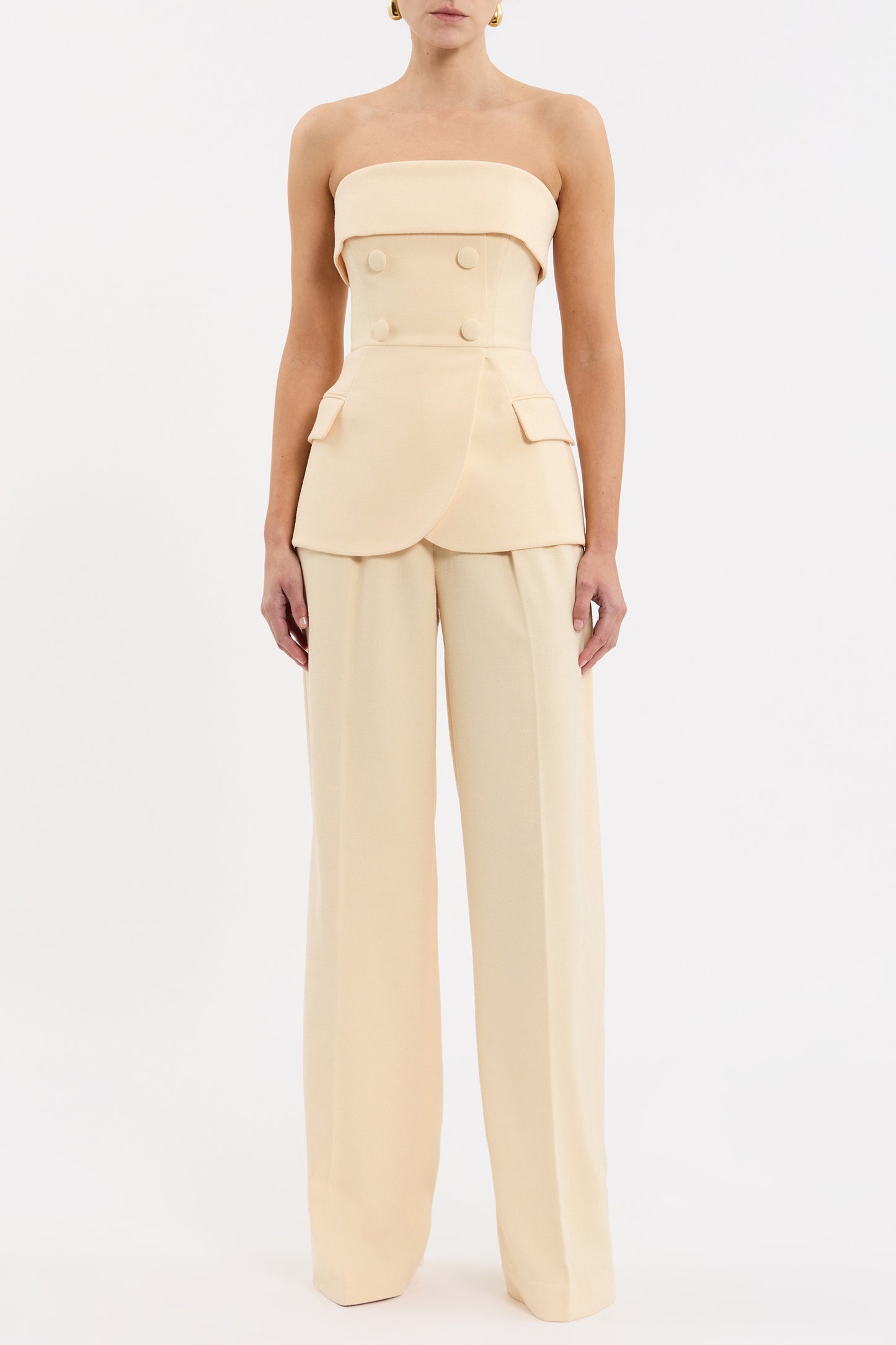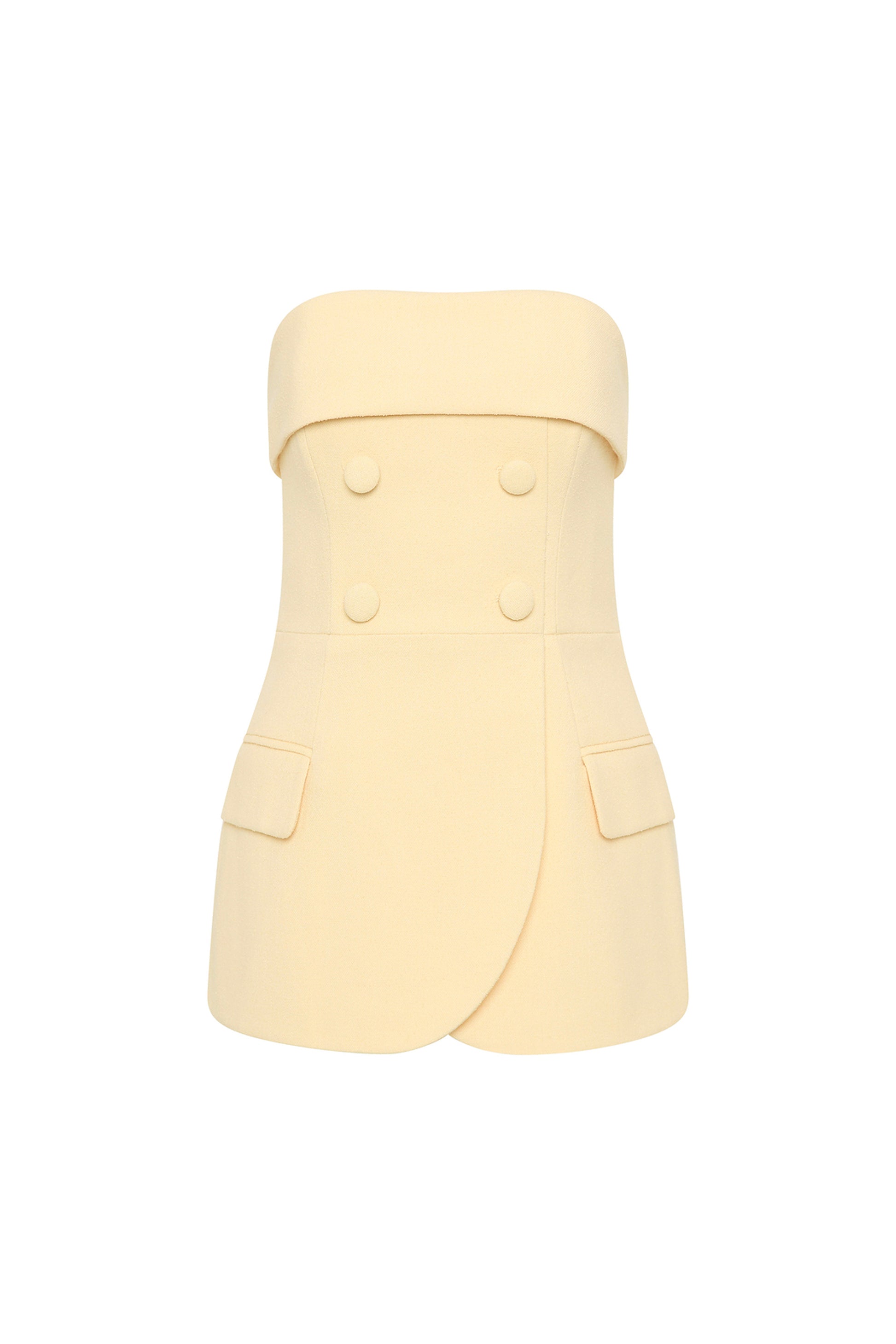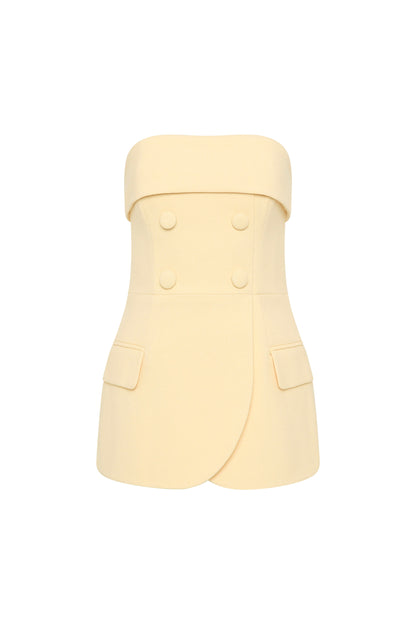 The Rowan Top is effortlessly chic in a playful butter-yellow hue, showcasing a structured suiting-inspired design. The strapless neckline and wide bust overlay beautifully complement the fitted bodice, cinched at the waist to enhance the feminine figure. Button detailing and front flap pockets add a tailored touch, while a zip fastening at the back ensures a precise fit. Sophisticated and refined, this top pairs perfectly with our Rowan Pant to create a coordinated set.