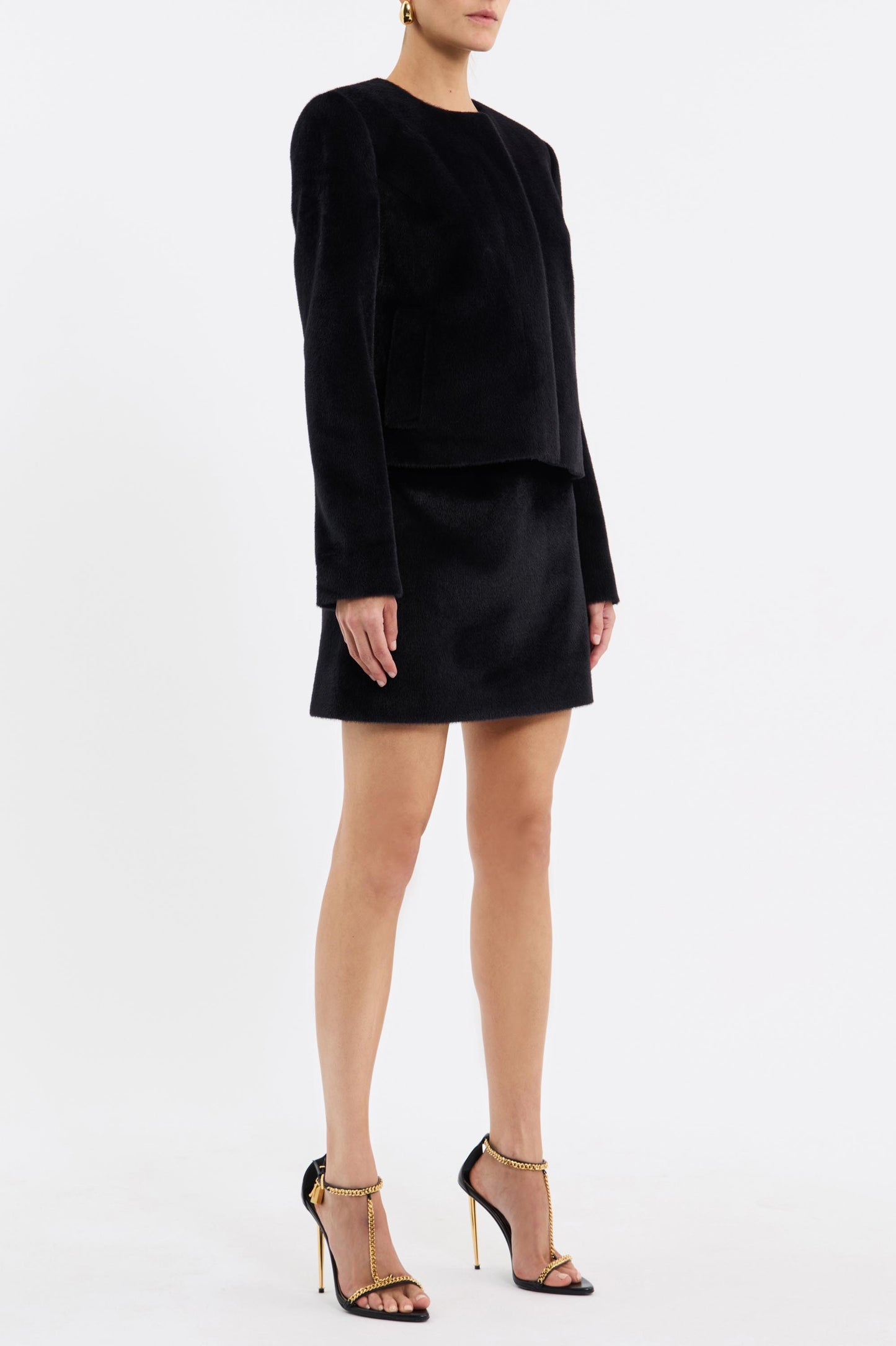The Spencer Jacket epitomises chic style in black, tailored from faux fur. Featuring a boxy fit and a refined scoop neckline, its relaxed silhouette embodies understated sophistication. A concealed placket enhances the polished aesthetic, while angled welt pockets add both practicality and style. Fully lined for comfort, this jacket is ideal for various occasions and pairs perfectly with our Spencer Skirt to create a matching set.
