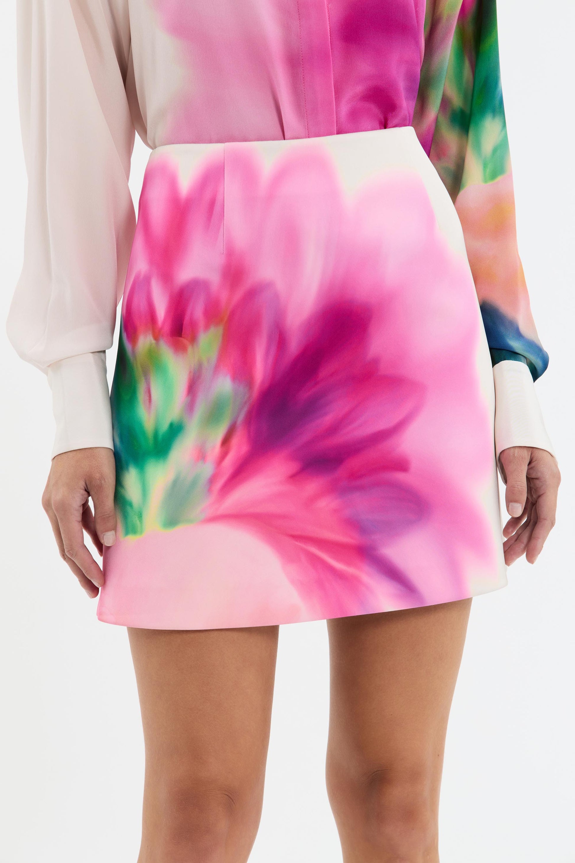 The Dahlia Blossom Skirt captivates with its vibrant custom floral print, tailored from bonded satin. Its A-line mini silhouette offers a refined shape, detailed with an invisible waistband for a seamless fit. Waist darts and a blind hem stitch ensure a sleek, polished finish, while lining provides utmost comfort. Secured with a zip fastening at the back, this skirt is a chic addition to your wardrobe and pairs effortlessly with our Dahlia Blossom Blouse.