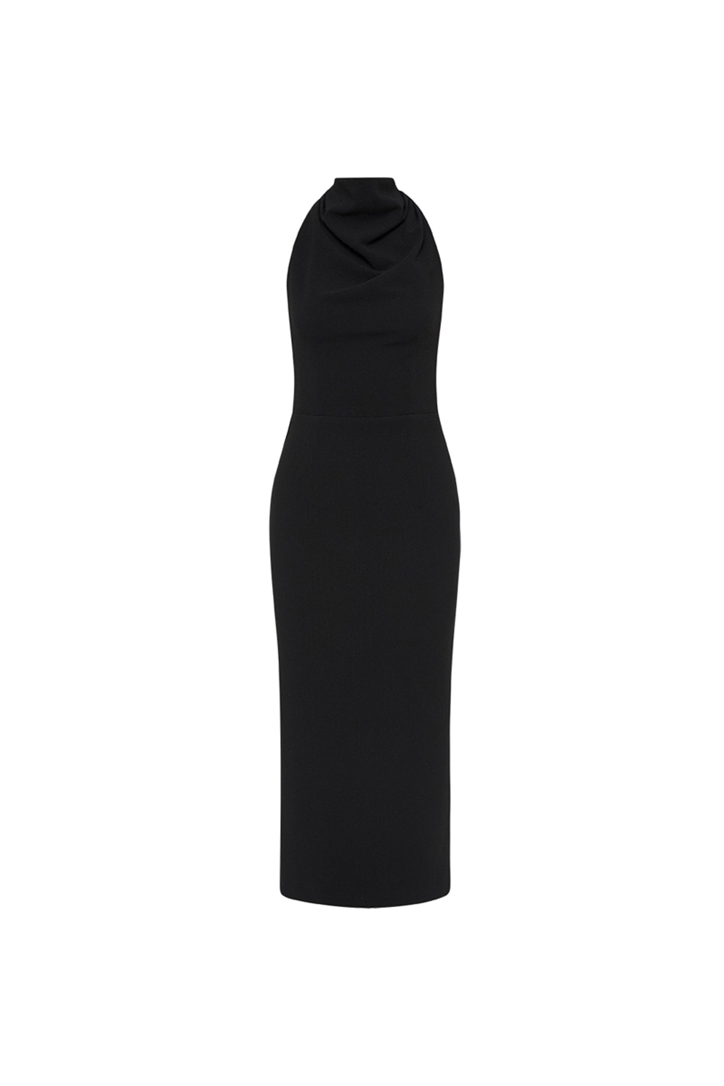 The Elora Halter Midi Dress in black embodies sophistication and class. Tailored from bonded crepe, the dress features a halter cowl neckline and twisted back, radiating allure and sophistication. The pencil skirt, cinched at the waist, creates a flattering silhouette, accentuated by a back split for added style and comfort. Complete with lining, this dress is the effortlessly elegant, making it the perfect choice for your next special occasion.