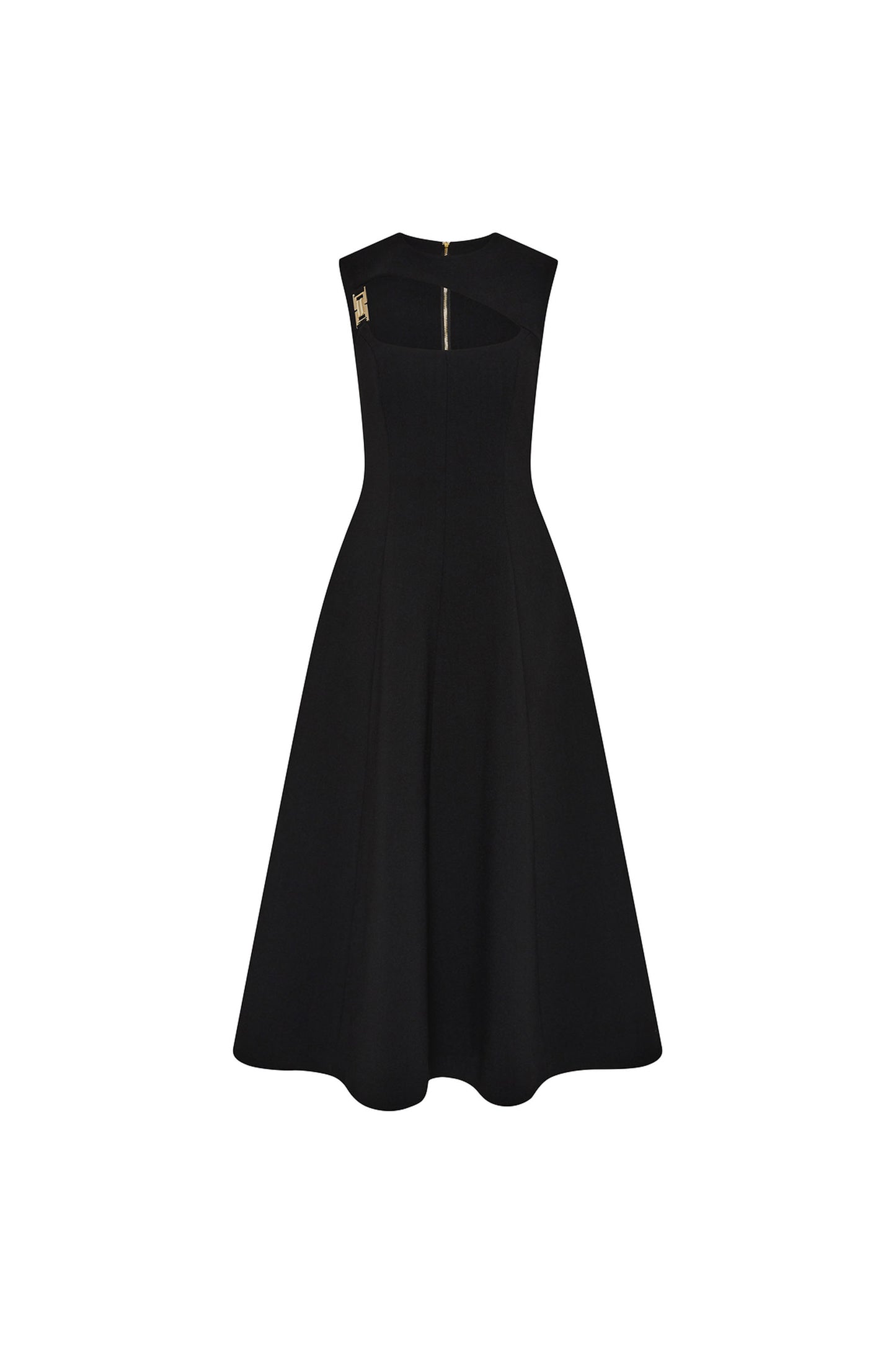 The Freyja Midi Dress in black is effortlessly elegant, tailored from bonded crepe. The asymmetrical bodice and open neckline harmonise beautifully with the fit-and-flare silhouette, elevated by gold art deco trim details for a touch of glamour. Fully lined, the dress is finished with an exposed zip fastening at the back for a polished look.
