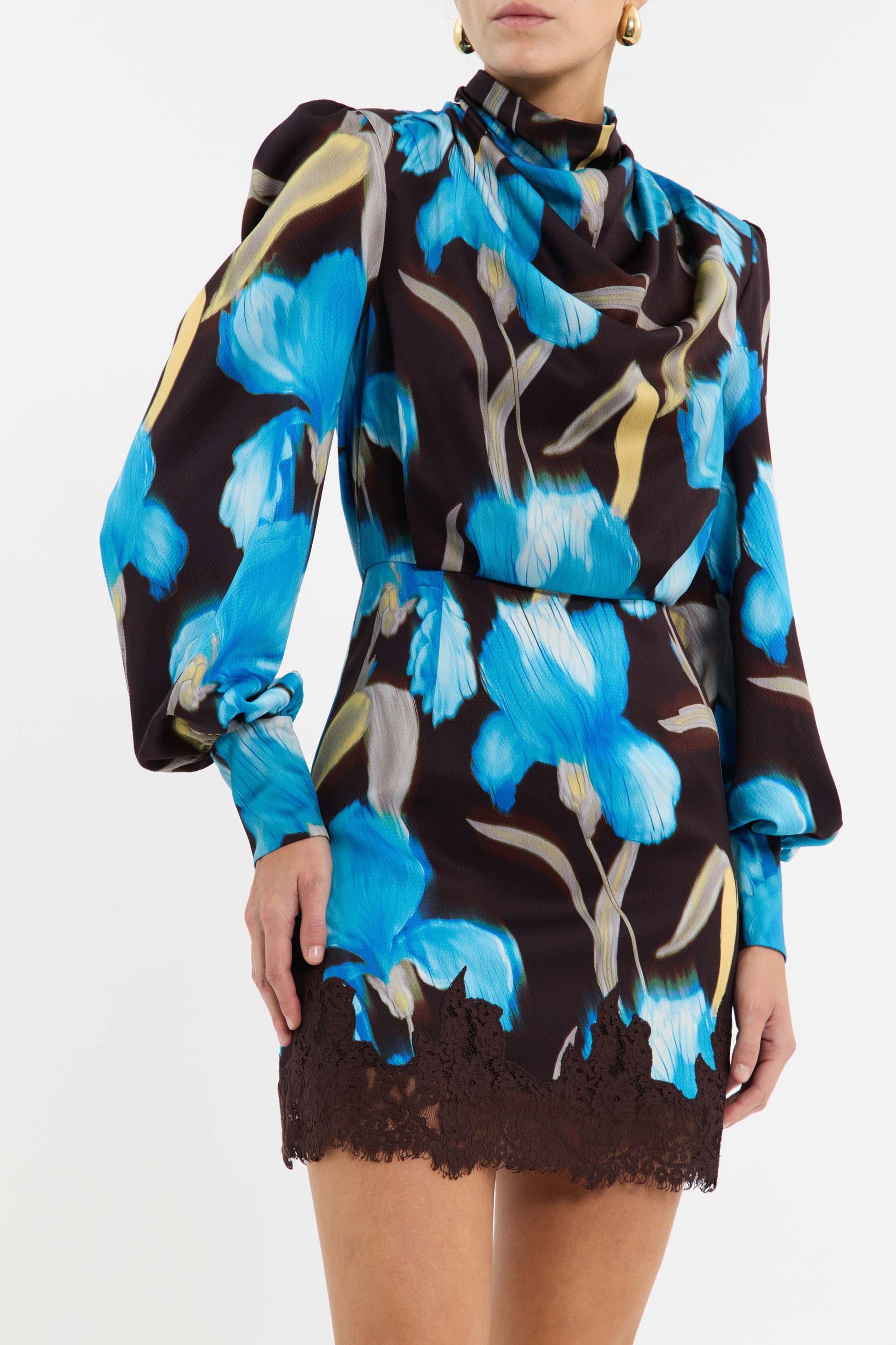 The Ingrid Mini Dress harmonises class and sophistication with a timeless blue iris floral print. Featuring a high cowl neckline, the relaxed bodice and long sleeves with cuffs shape an elegant silhouette, enhanced by sleeve plackets and buttons at the back. The fitted mini skirt is elevated with a lace applique hem, secured with an invisible zip fastening at the back. Lined, this dress is a stylish choice for your next day or night occasion.