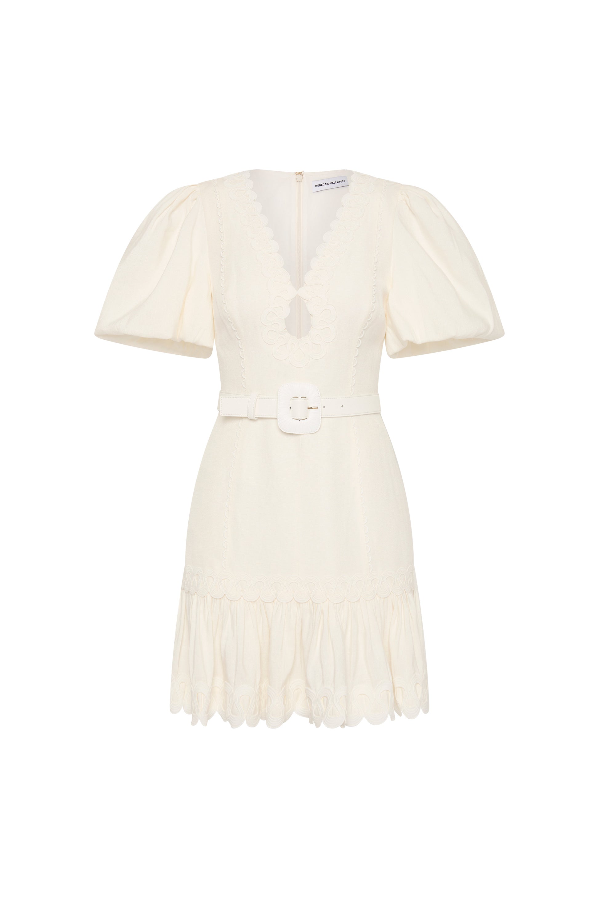 The Kahlia Mini Dress in ivory radiates chic style. Featuring short puff sleeves, its V neckline and fitted bodice with a front cut out offer a refined shape, detailed with princess seams and scallop trim for a polished finish. The tiered mini skirt creates an elegant silhouette, elevated by a self-belt to flatter the figure. Complete with an invisible zip fastening at the back for effortless wear, this versatile dress is a timeless addition to your wardrobe.