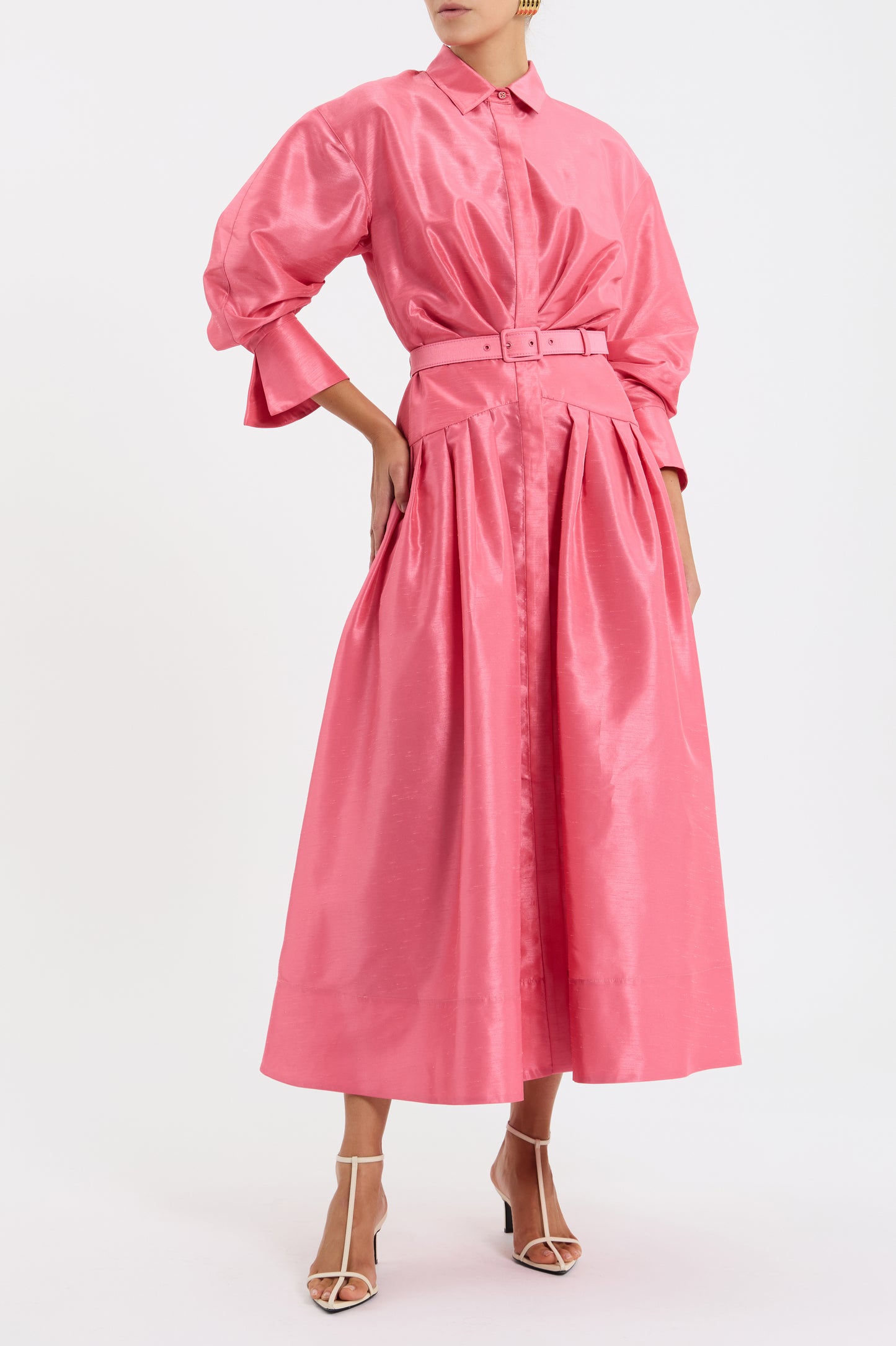 The Maple Shirt Midi Dress in pink blends modern sophistication with effortless elegance, crafted from slub taffeta. A sleek stand collar and voluminous cocoon sleeves complement the refined shirt dress silhouette, elevated by a drop waist yoke and a self-belt to define the shape. A concealed placket and side seam pockets add practicality, while a removable slip dress offers versatile styling. Perfect for both day and night occasions, this dress is a must-have addition to your wardrobe.