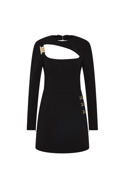 The Milena Mini Dress in black infuses chic style with modern design. Tailored from bonded crepe, its asymmetrical fitted bodice and long sleeves sculpt a flattering silhouette, accentuated by a cinched waist. The elegant wrap mini skirt is adorned with gold art deco trim, exuding opulence and glamour. Fully lined, this dress is perfect for your next event.