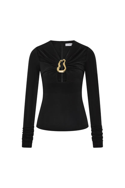 The Mischa Long Sleeve Top in black seamlessly blends modern design and feminine elegance. Tailored from premium jersey, the fitted silhouette and gathered long sleeves sculpt a flattering shape, adorned with front cut outs and gold hardware for a touch of opulence. Secured with an invisible zip fastening at the back, this top is the perfect blend of chic style and practicality.