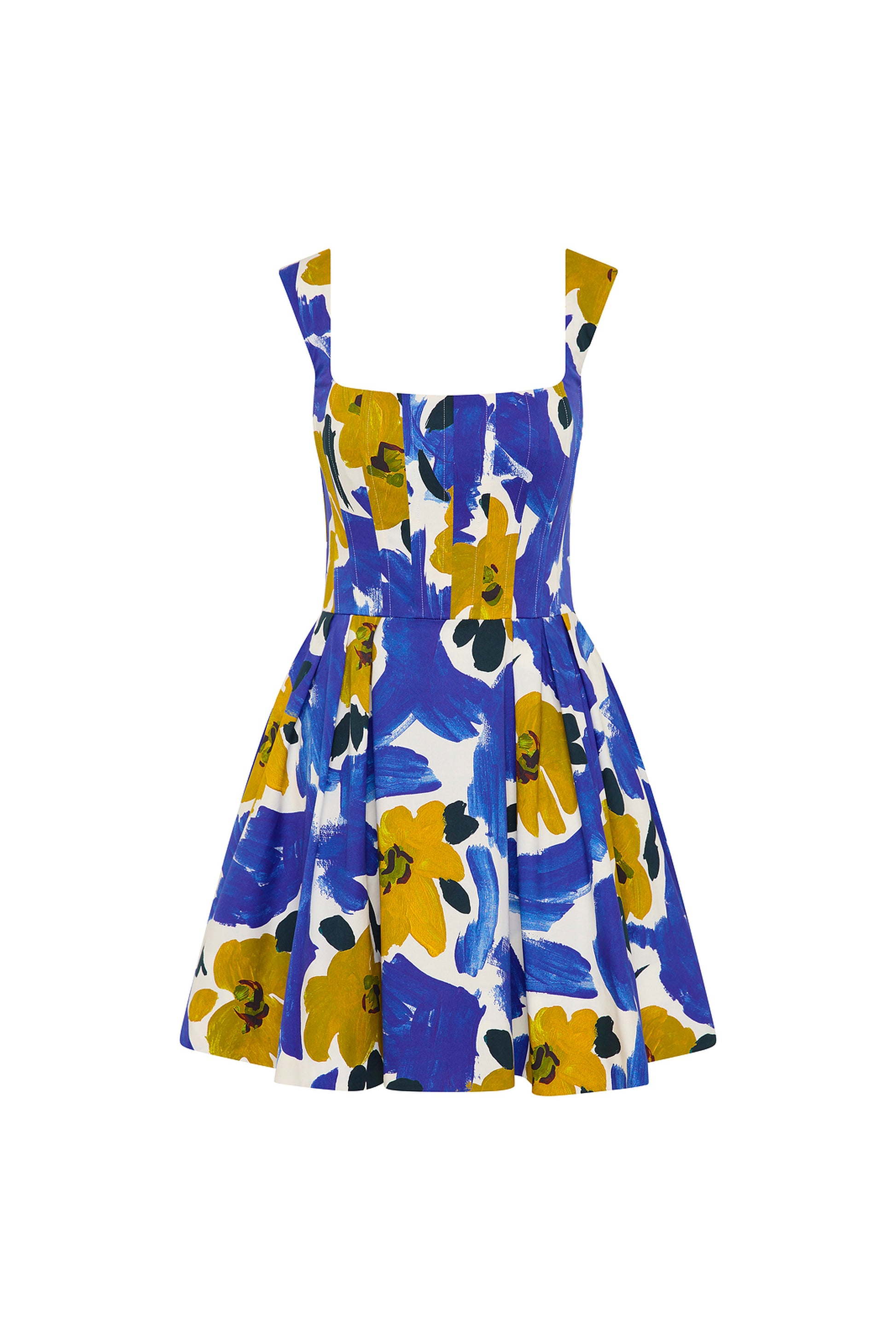 The Sabina Mini Dress radiates playful elegance with its playful print. Featuring a fitted bodice with internal boning, its square neckline and wide straps offer both support and style. Cinched at the waist, the circular mini skirt offers an elegant silhouette. Finished with a zip fastening at the back and fully lined for comfort, this dress is a chic choice for your next special occasion.