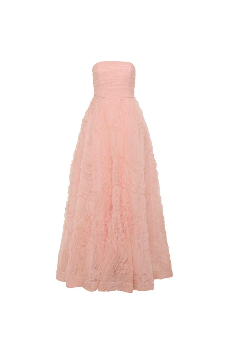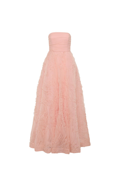 The Willow Gown is captivating in blush pink, designed to make a statement. Tailored from embroidered mesh, it showcases a stunning strapless neckline and a fitted bodice supported with boning. Cinched at the waist, the voluminous circular skirt creates an elegant silhouette, secured at the back with a zip fastening. Fully lined for utmost comfort, this gown is a striking choice for your next special event.